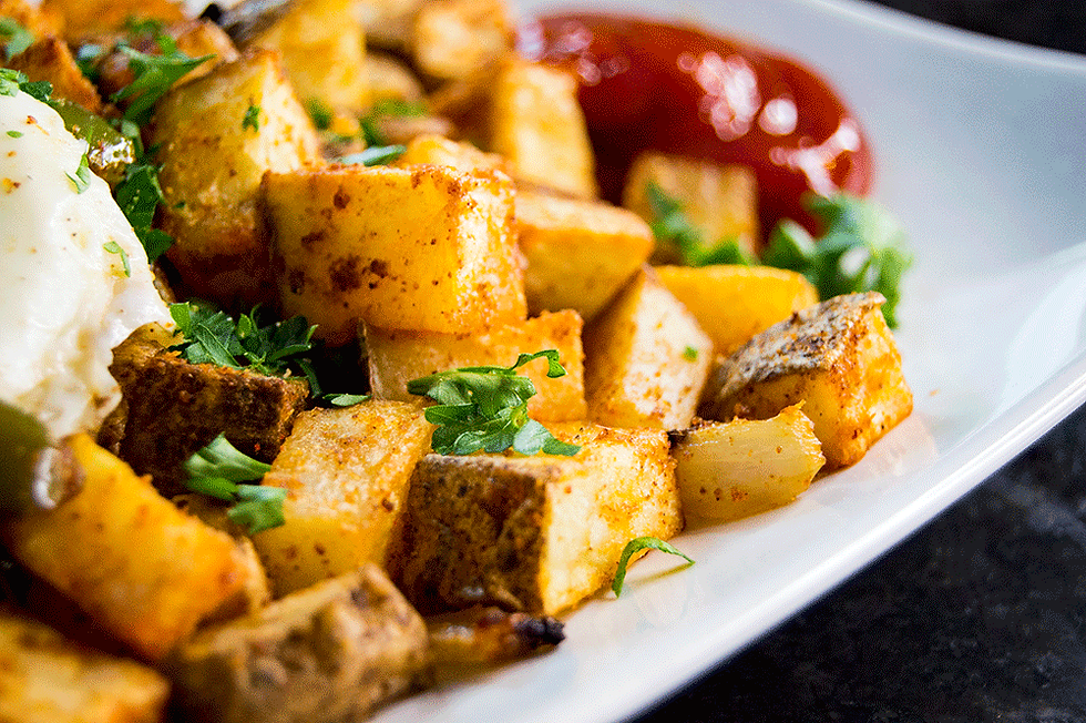2. Arrange the potatoes in a single layer in the basket of an air fryer. Cook at 400 F for 20-30 minutes, opening to stir every 10 minutes or so to cook evenly. Serve with poached eggs and sriracha ketchup. Enjoy!